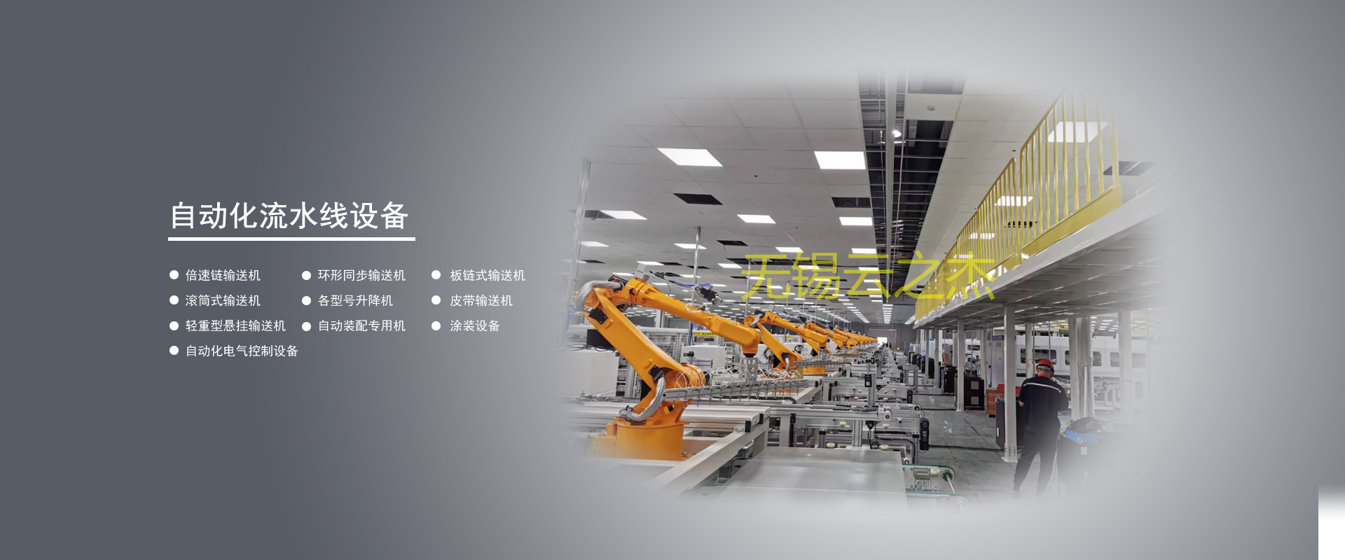 无锡市云之杰自控设备有限公司位于久负盛名的阳山水蜜桃种植地—阳山脚下。这里有便利的交通与多样物流方式,本厂为您制作的任何设备都可以在3天内到达国内大部分地区。沪、杭、宁地区更是当天到达。如果您莅临指教或洽谈业务,从锡宜高速(S48)公路陆区道口出来3分钟即可到达本公司。 无锡市云之杰自控设备有限公司是一家制作各类自动化流水线生产线设备的专业厂家。产品包括倍速链输送机、环形同步输送机、板链式输送机...